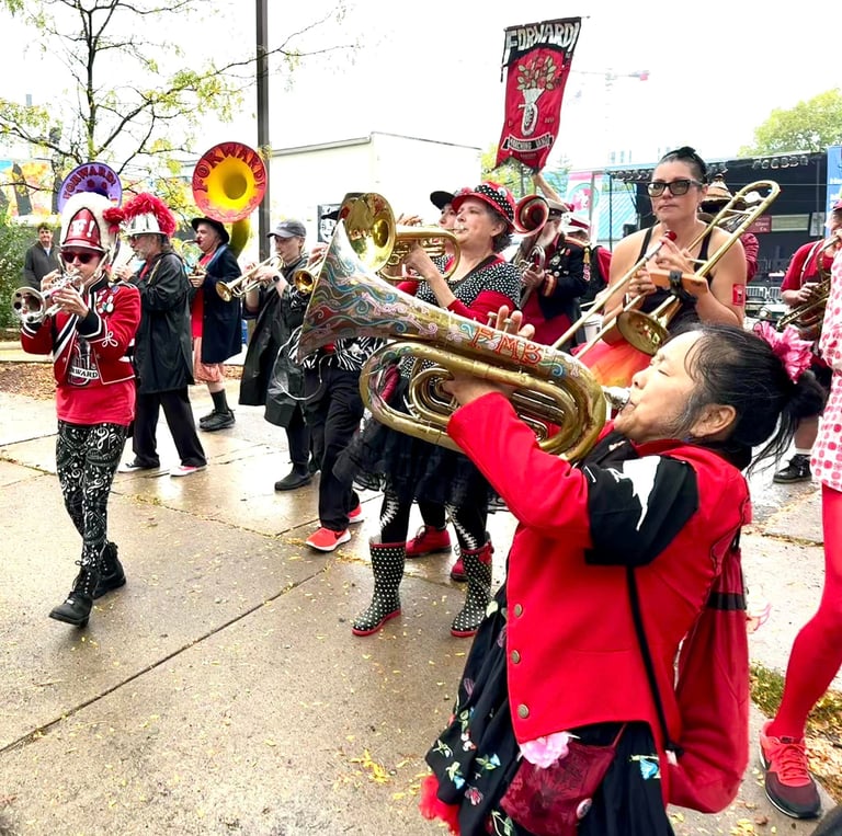 Forward! Marching Band is a roughly 30-piece activist street band from Madison, Wisconsin. We are a community-based, democratic, music-making collective that believes in using music to help fuel social change, have fun, and build community.